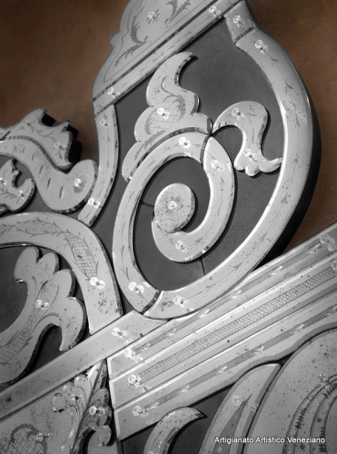 Mirabile riproposizione della maestria dei vetrai di Murano che operarono in Francia alla corte del "Re Sole". Lingue e ritagli di vetro a specchio, molato, traforato e inciso a mano con ruota in pietra arenaria.
