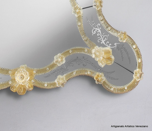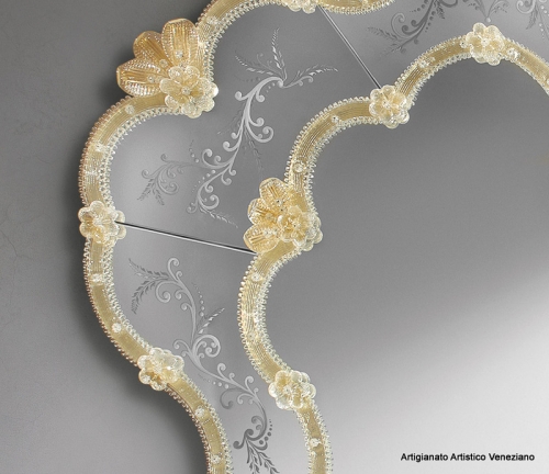 Specchio con cornice ad una fascia specchiata ed incisa a mano con ruota in pietra arenaria. Le decorazioni in vetro di Murano sono realizzate a mano dai nostri maestri vetrai. La particolare forma dello specchio sta ad evocare le barocche fantasie della Venezia del ‘700 Vivaldiano.