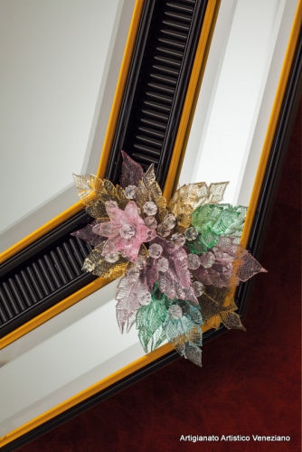 Le decorazioni, di bellissima fattura, sono realizzate in vetro di Murano. I fiori e le foglie, in vetro colorato trasparente, e la canna liscia, in vetro colorato, sono state forgiate dalle mani esperte dei nostri maestri vetrai.