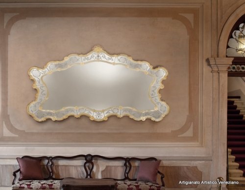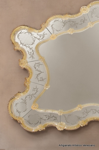 Elegante e lussuosa specchiera ad una fascia specchiata, composta da più parti in vetro intagliato, molato ed inciso a mano con ruota in pietra arenaria. La canna, i ricci, le foglie e i fiori che adornano la cornice sono realizzati dai nostri maestri vetrai, utilizzando esclusivamente il vetro di Murano.