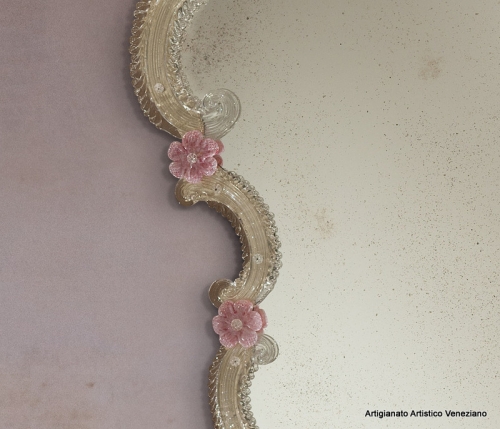 Specchio leggermente antichizzato, la cui ricca cornice in vetro di Murano è composta da ricci e foglie in vetro colorato trasparente e da fiori e rosoni in pasta di vetro colorata.