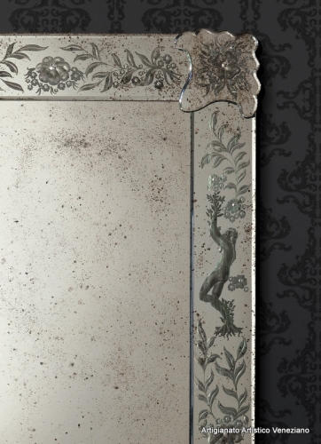 Specchio antichizzato e minuziosamente molato ed inciso a mano con ruota in pietra arenaria.