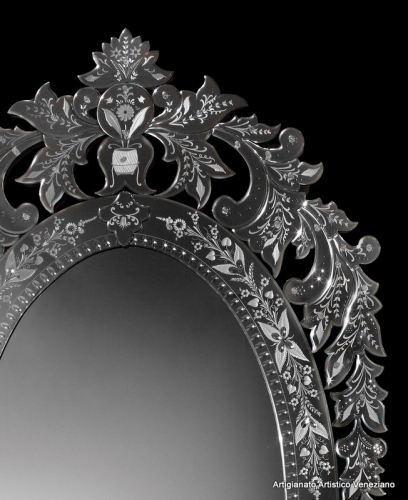 Mirabile riproposizione della maestria dei maestri specchieri che lavorarono in Francia alla corte del "Re Sole". Lingue e ritagli di vetro a specchio, traforato, molato ed inciso con ruota in pietra arenaria e virtuosismi.