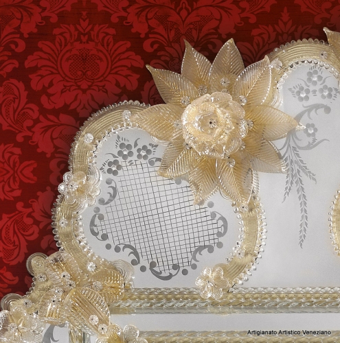 Elegante specchio con cornice a 2 fasce specchiate e cimiero. Lo specchio è decorato con fiori, foglie, ricci e canne in vetro di Murano. Le incisioni sono realizzate a mano con ruota in pietra arenaria. La particolarità di questo specchio è data dal ricco cimiero che evoca il gusto sfarzoso e l’ostentata ricchezza della Venezia del ‘600 e ‘700.