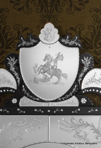 Imponente specchio con cimiero minuziosamente molato ed inciso a mano con ruota in pietra arenaria. Decorato con una cornice in vetro nero incisa.