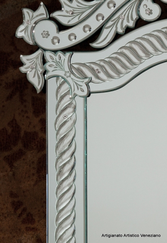 Mirabile riproposizione della maestria dei vetrai di Murano che operarono in Francia alla corte del "Re Sole". Lo specchio presenta dei veri e propri virtuosismi alla mola.