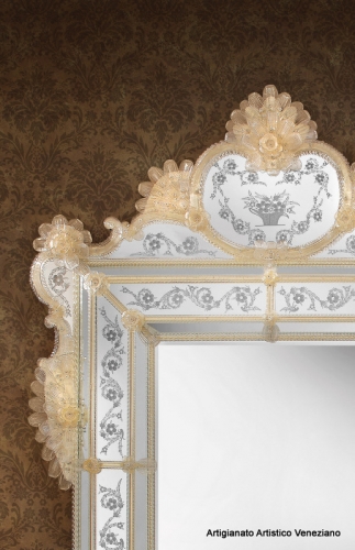 Specchio con cimiero e cornice a tre fasce specchiate. La particolarità di questo specchio è data, oltre che dalle precise incisioni realizzate a mano con ruota in pietra arenaria, dai ricchi decori in vetro di Murano avvolgono il cimiero e le fasce della cornice. Lusso ed esclusività sono il marchio di fabbrica di questa collezione che mira ad evocare il gusto sfarzoso e l’ostentata ricchezza della Venezia del ‘600 e ‘700.
