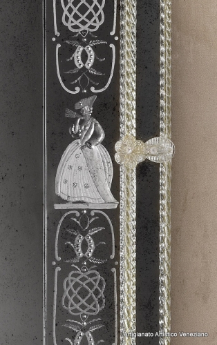 Specchio inciso a mano con ruota in pietra arenaria e decorato con fiori, foglie e canne in vetro di Murano. Il virtuosismo dimostrato nei motivi incisi evocano la precisione dei dipinti del grande vedutista veneziano. L’effetto invecchiato, con una speciale procedura di antichizzazione, distingue ed impreziosisce con garbo lo specchio.