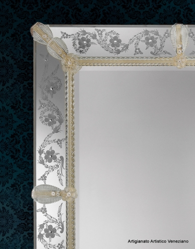 Elegante specchio ad una fascia specchiata ed incisa a mano con ruota in pietra arenaria e decorato con fiori, foglie e canna in vetro di Murano.