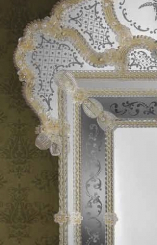 Lussuosa specchiera con cornice a due fasce e cimiero. Decorato con ricci, canne, foglie e fiori in vetro di Murano trasparente e oro. Le incisioni sulla fascia larga e sul cimiero che sovrasta imponente lo specchio sono realizzate a mano con ruota in pietra arenaria.