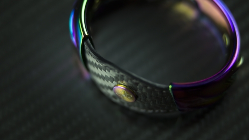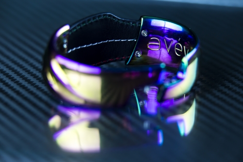 Bracciale artigianale realizzato con materiali automobilistici quali titanio, fibra di carbonio e vero cuoio. Anodizzato al titanio con passaggio di corrente elettrica senza controllo, seguendo la densità del materiale per ottenere scale di colore.