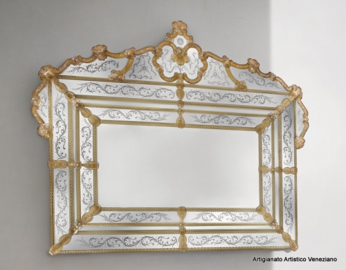 Specchio veneziano, cm 117 x 143, a due fasce specchiate e cimiero incisi a mano, realizzato secondo l’antica tradizione dei maestri specchieri... »