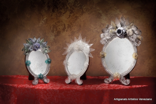 Specchi da tavolo, cm 16 x 31 e cm 28 x 44, realizzati secondo l’antica tradizione dei maestri specchieri muranesi.